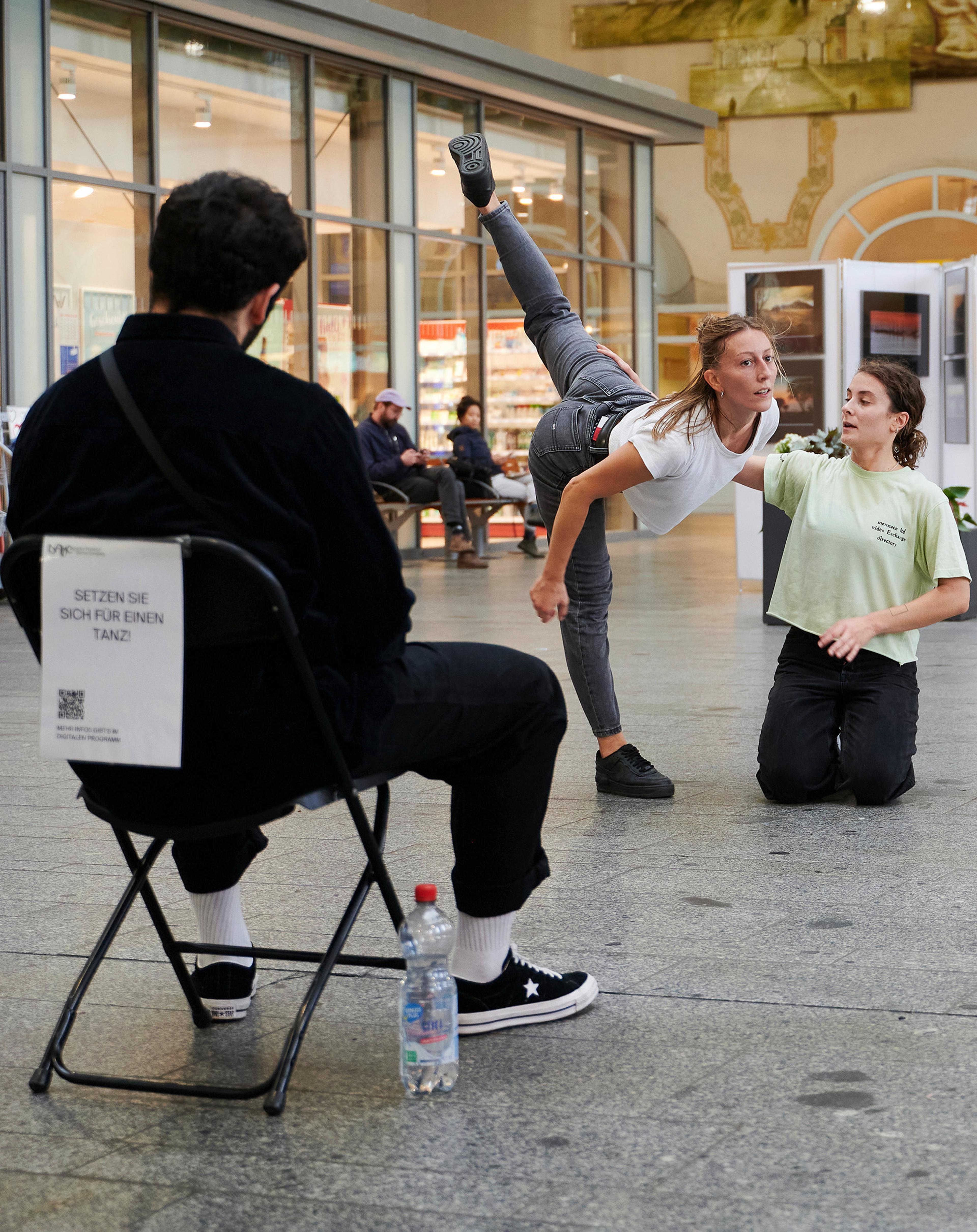 „One One One“ beruht auf einer einfachen Vereinbarung: Wer sich auf einen Stuhl setzt, bekommt einen improvisierten Tanz geschenkt. Tänzer*in und Zuschauer*in müssen dafür Augenkontakt halten. Wenn dieser endet, endet auch der Tanz. Alle, die nicht auf einem der Stühle sitzen, können dieses Geschehen von außen beobachten. Sie sehen zwei Menschen, die durch Tanz Kontakt aufnehmen. Eine Person tanzt für die andere. Wer auf dem Stuhl sitzt und zusieht, wird dabei zum Ziel und Grund des Tanzes. In der Performance zeigt sich ein Verständnis von Tanz, das die Arbeit von Ioannis Mandafounis grundsätzlich prägt. Getanzt wird nicht, weil es schön aussieht oder athletisches Können beweisen kann, sondern als ein Mittel, sich zu begegnen, als Kommunikation. Diese kann man sich aber nicht in einem einfachen Sender-Empfänger-Modell vorstellen, in dem Information schön verpackt von A nach B verschickt wird.