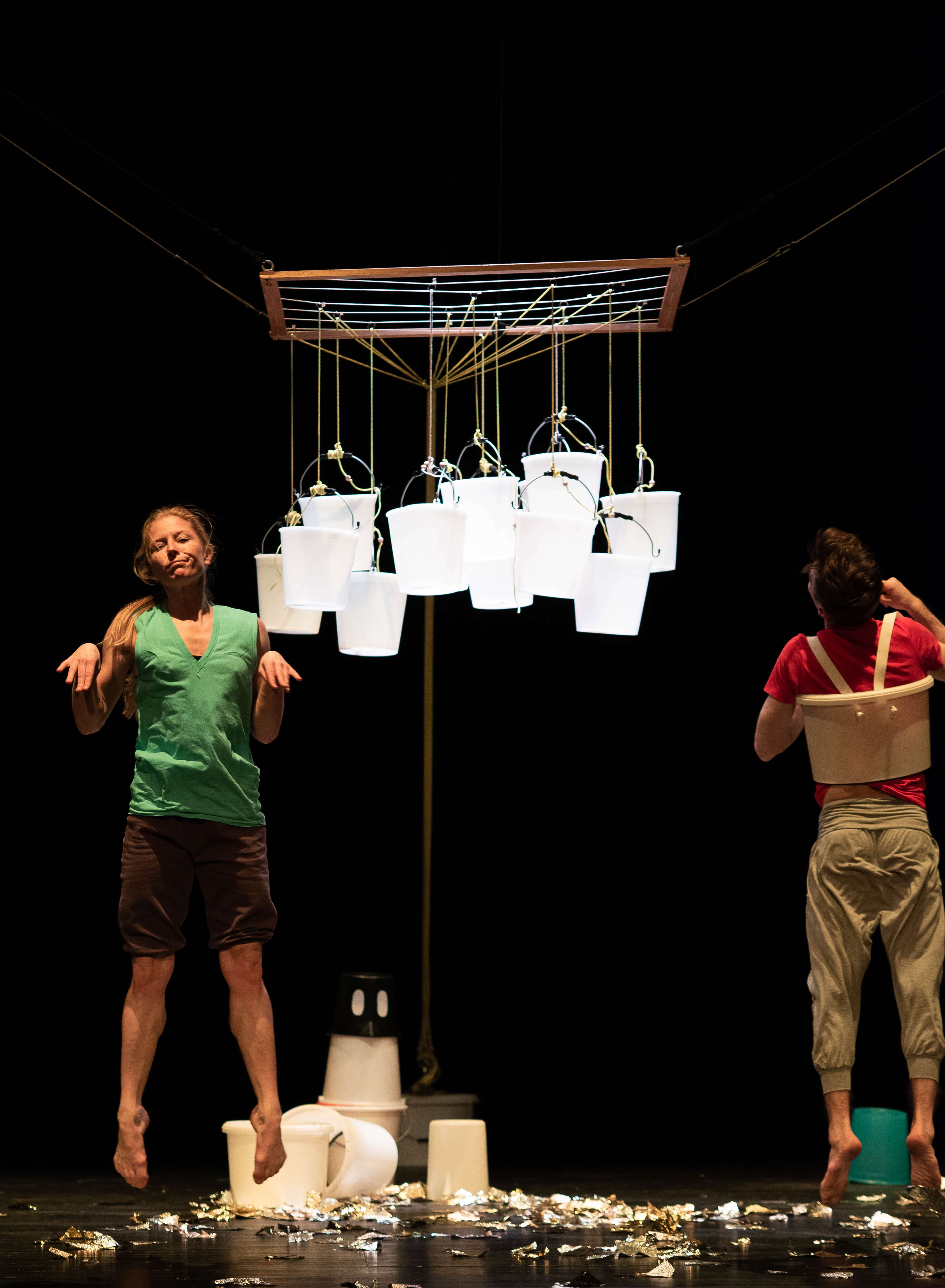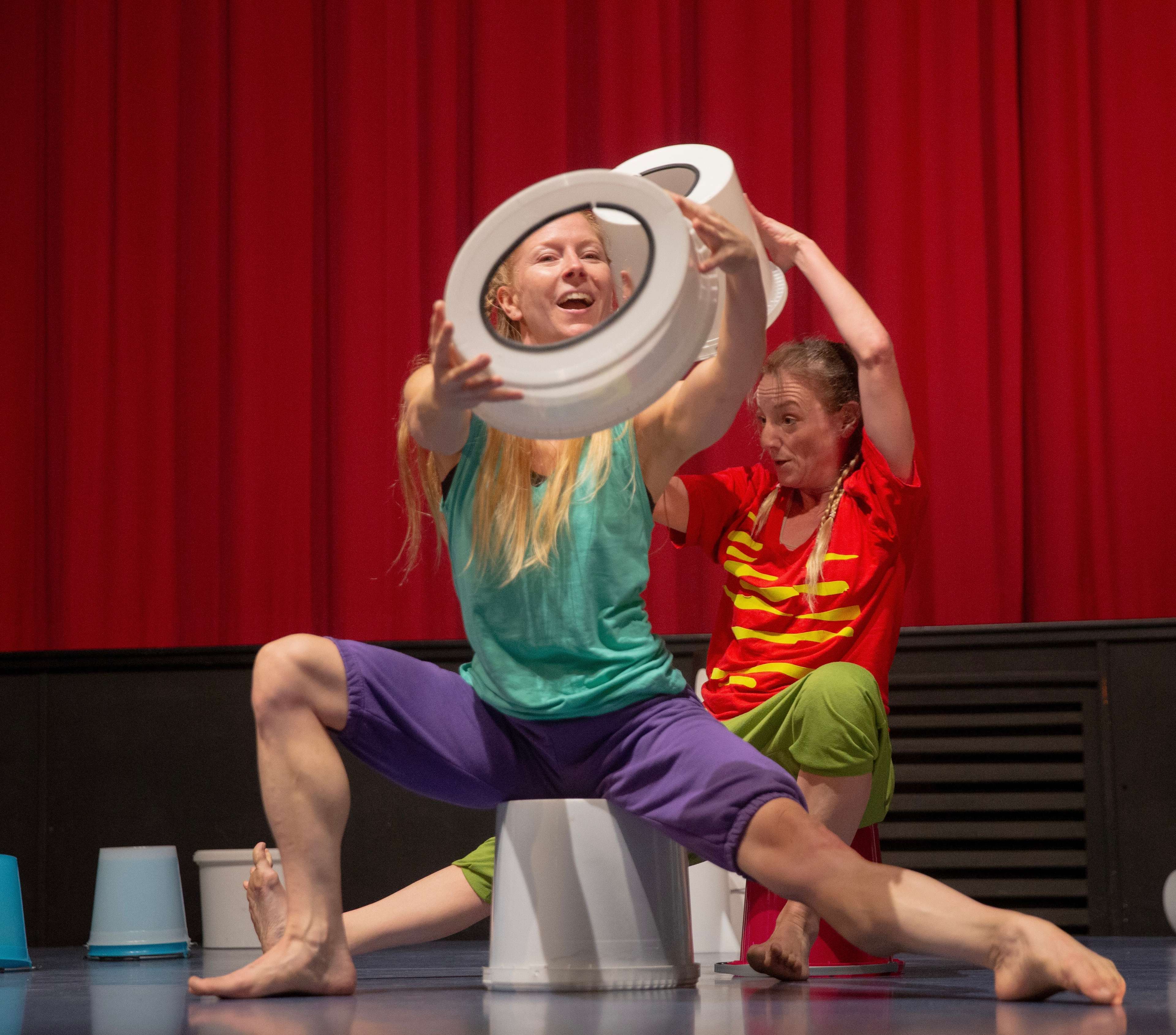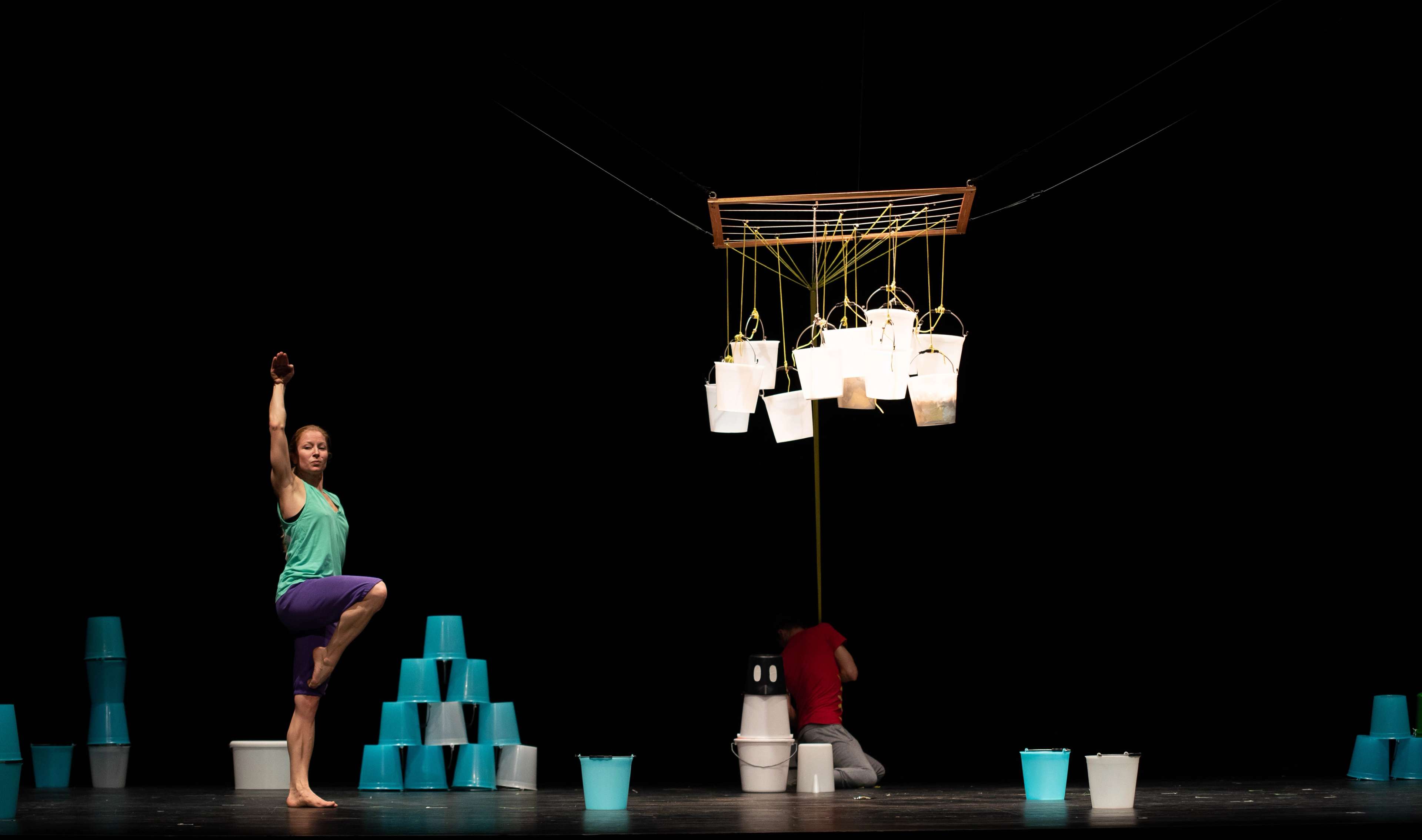 Two dancers bring these questions to life on stage and transport their young audience into a world of big and small surprises. Dozens of colorful pails in various forms and sizes offer sheer endless possibilities for transforming the stage. A sound collage composed by Gregor Praml supports „elephant walk” as it becomes a landscape of ice and snow, a farm, hoofs, paws, water or clouds.
