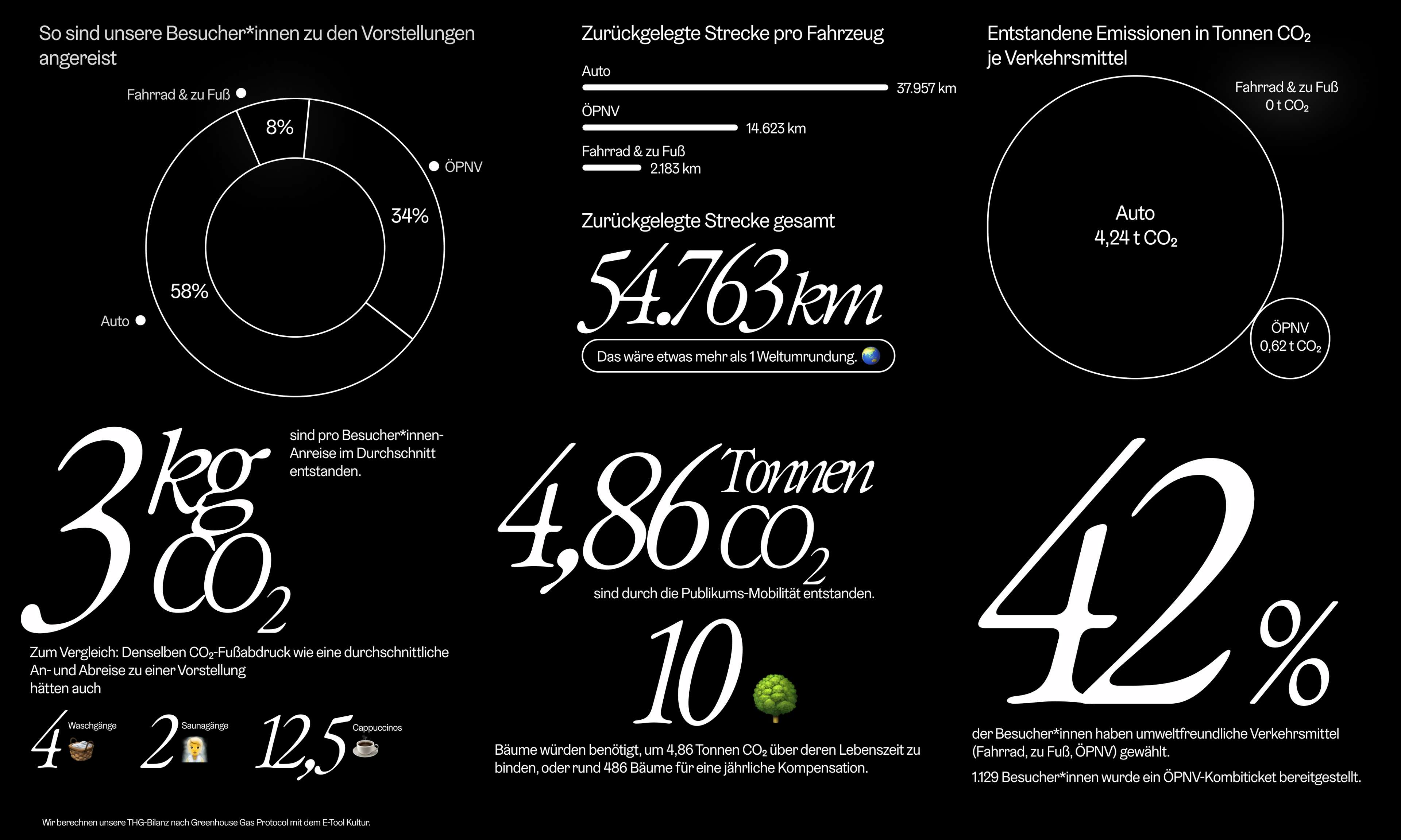 Als „Join“ im September Premiere in Dresden gefeiert hat, haben wir unser Publikum über seine Anreise befragt. „Join“ wird im Programm „Fonds Zero“ der Kulturstiftung des Bundes gefördert, was Kultureinrichtungen darin unterstützen soll, klimafreundlichere Produktionsformen und neue Ästhetiken mit geringstmöglicher Klimawirkung zu erproben. Im Laufe des Prozesses werden die CO2- Emissionen erfasst, so eben auch die bei der Anreise unseres Publikums zu den Vorstellungen in Dresden. Wir hoffen, dass wir durch Einsparpotential, das sich bei diesem Projekt zeigt, auch in Zukunft unsere Arbeitsweise ökologisch nachhaltiger gestalten können.